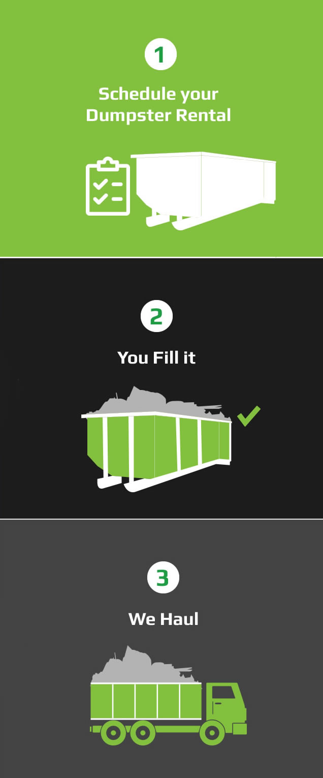 We will drop-off our Dumpster so you can fill it up, and when ready we will pick it up and take care of the waste disposal.